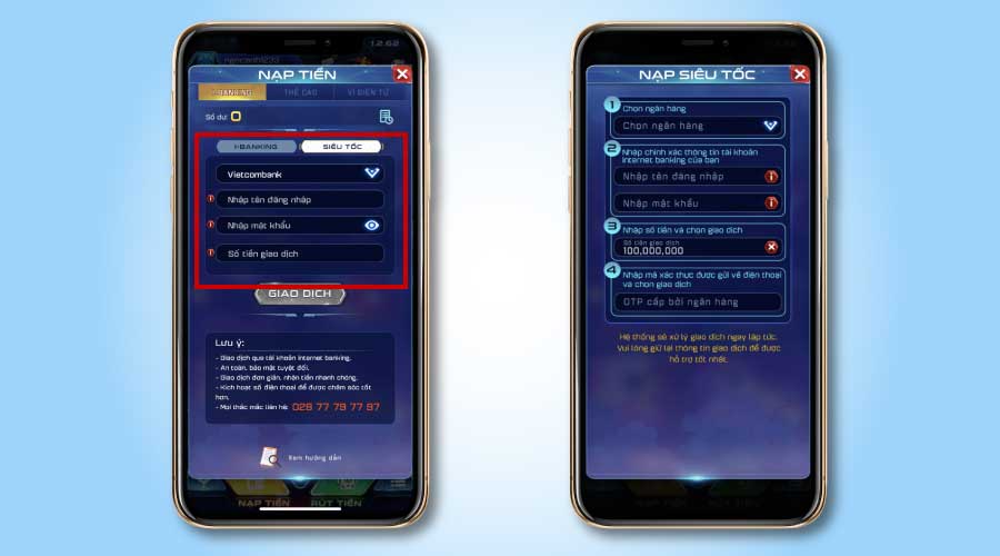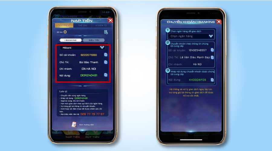 • Luôn chuyển tiền theo hình thức 24/7 để giao dịch đến người nhận nhanh nhất. Nếu không lệnh nạp sẽ bị từ chối đến khi cổng game nhận được sao kê chuyển khoản của ngân hàng.